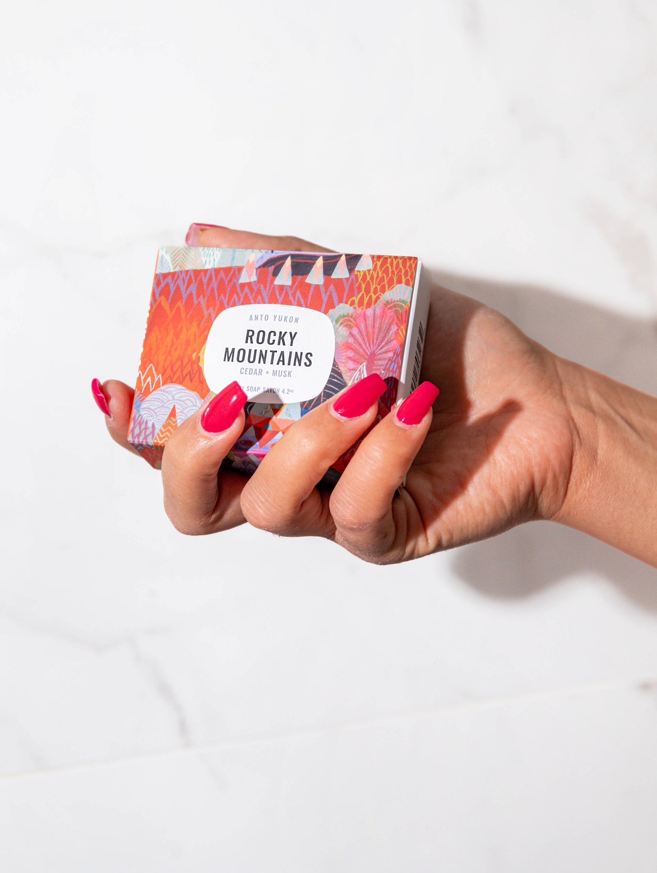 This bar soap is inspired by the mountain trails and earthy scents of the Rocky Mountains. Escape into the wilds of the great outdoors every time you reach for your soap. Combining pure, genuine ingredients with artful design, each bar in this line of all-natural soap is inspired by a different region of the country’s vast and rich landscape. Scent: Cedar, Bergamot, Patchouli, Sweet Orange 120 g / 4.2 oz Box artwork by Canadian contemporary artist Meghan Hildebrand. All soaps are handmade in our Yukon studio using 100% natural ingredients, scents, colourants. Ingredients: Canola, Aqua (Water/Eau), Cocos Nucifera (Coconut) Oil, Olea Europaea (Olive) Fruit Oil, Elaeis Guineensis (Palm) Oil *, Sodium Hydroxide **, Cedrus Deodara (Cedar) Wood Oil, Citrus Bergamia (Bergamot) Peel Oil, Pogostemon Cablin (Patchouli) Oil, Citrus Sinensis (Sweet Orange) Peel Oil, Rubia Tinctona (Madder) Root Powder *Certified RSPO sustainable **none remains after saponifying oils into soap