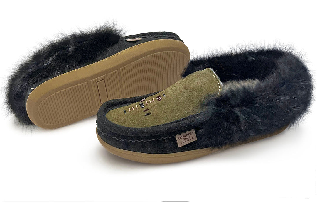 Men's Fur Trim/Lined Beaded Slippers- Black/Army