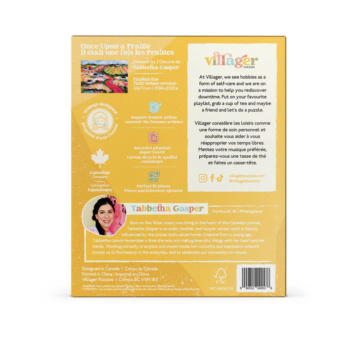 Experience the charm of small prairie towns, where friends and neighbours come together, and life is shaped by the sun, wind, and soil. This beautifully detailed puzzle, painted by Saskatchewan artist Tabbetha Gasper, captures the warmth and simplicity of rural life. A runner-up in Villager Puzzles' 2024 art competition, Once Upon a Prairie is perfect for cozy evenings with a cup of tea, shared with loved ones or savoured solo.