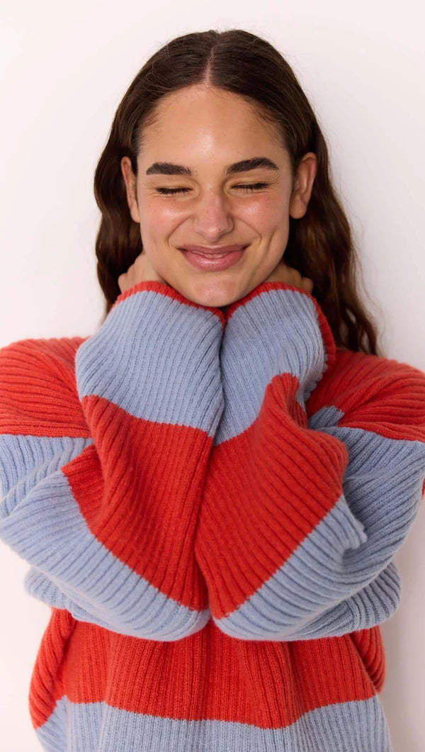 Wrap yourself in cozy comfort with this Freja Stripe Chunky Knit Sweater, featuring bold coral and blue stripes that make a statement. The chunky knit construction delivers warmth and texture, perfect for layering through chilly seasons. Its relaxed fit pairs effortlessly with jeans or leggings for an effortlessly stylish look. Whether you're heading out for coffee or settling in at home, this striped beauty keeps you feeling snug and looking sharp.