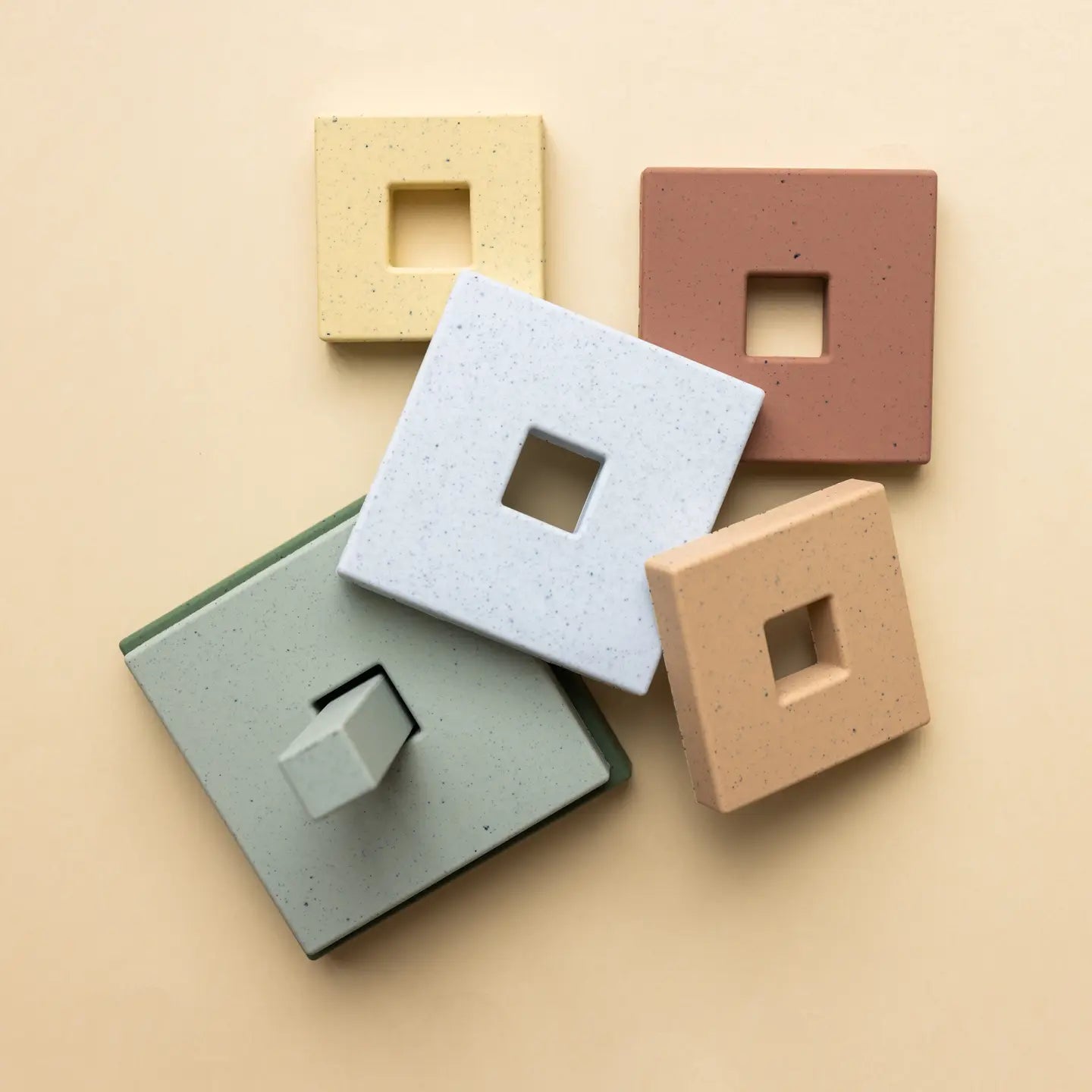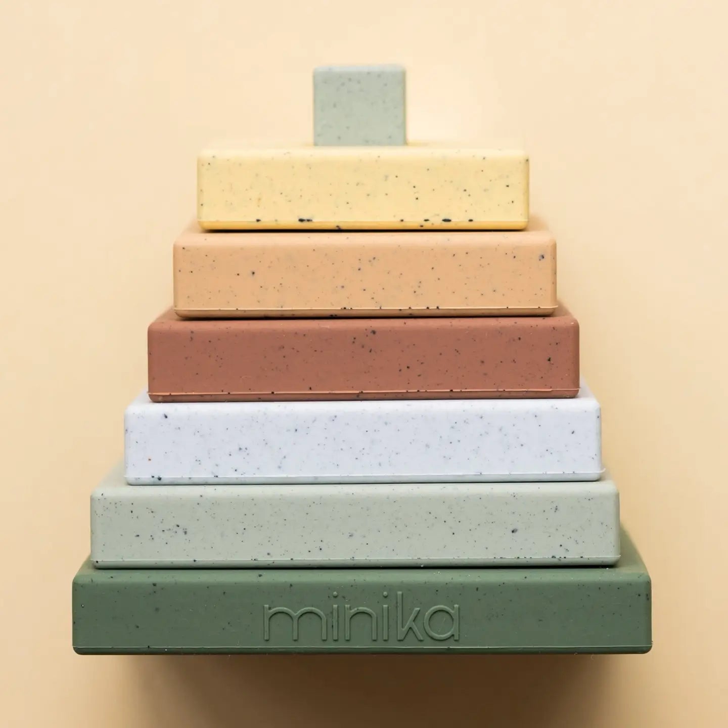 A cute silicone stacking tower in 6 of Minika's colors! For the 0-3 years. The toy can also be chewed on if baby is teething.  Food-grade silicone. BPA, latex, PVC and phthalates free.  Dishwasher safe.