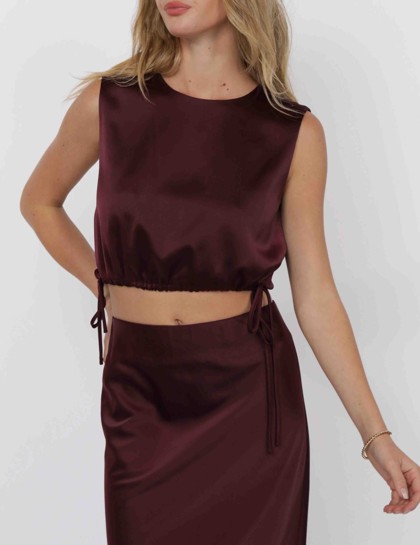 Elevate your fall style with this Deep Trance Satin Crop Tank in a rich wine shade. Its silky, timeless satin fabric adds a classy touch, making it the perfect match for your seasonal events. Playfully pair it for effortless chic all autumn long. Grab the matching skirt for a seamless look.