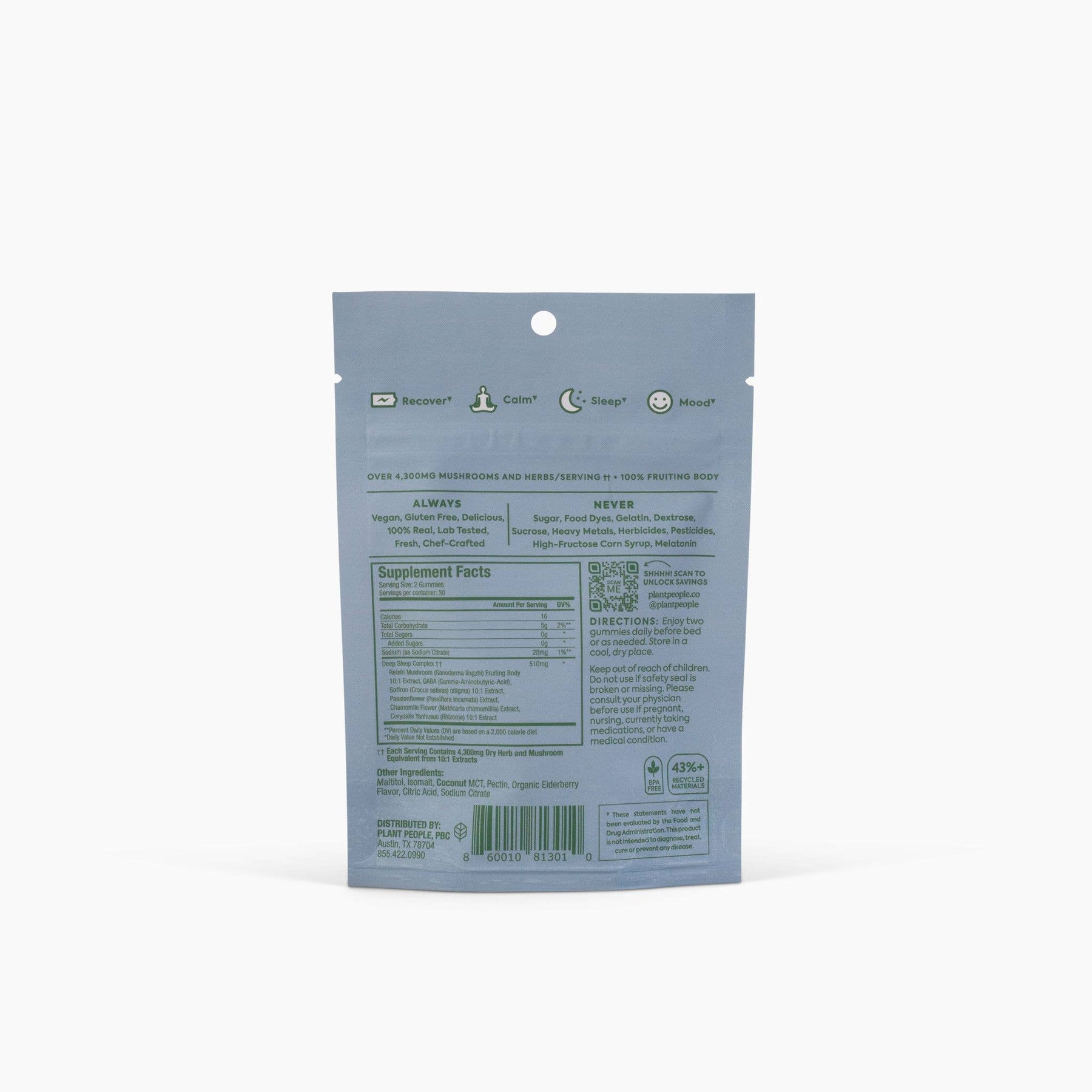 A 5 night trial of zero-sugar, mushroom gummies to help support rest and deep, restorative sleep. Formulated to help wake up refreshed, not groggy. Melatonin-free. 10 gummies per pouch.