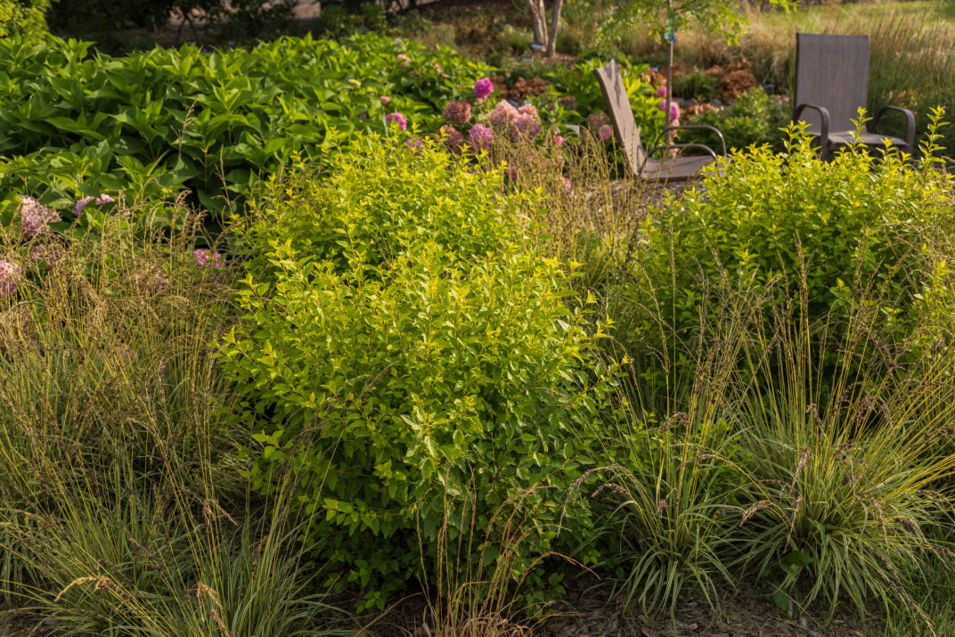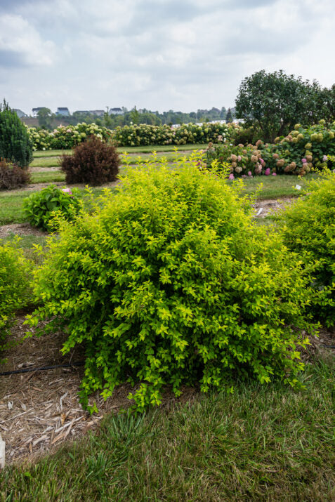 Lucky Devil Ninebark (Physocarpus opulifolius 'ZLEMppl') – compact, colourful, and ultra-hardy! This Proven Winners® selection has golden-chartreuse foliage that deepens to amber and orange in fall, paired with spring white blooms and textured bark.