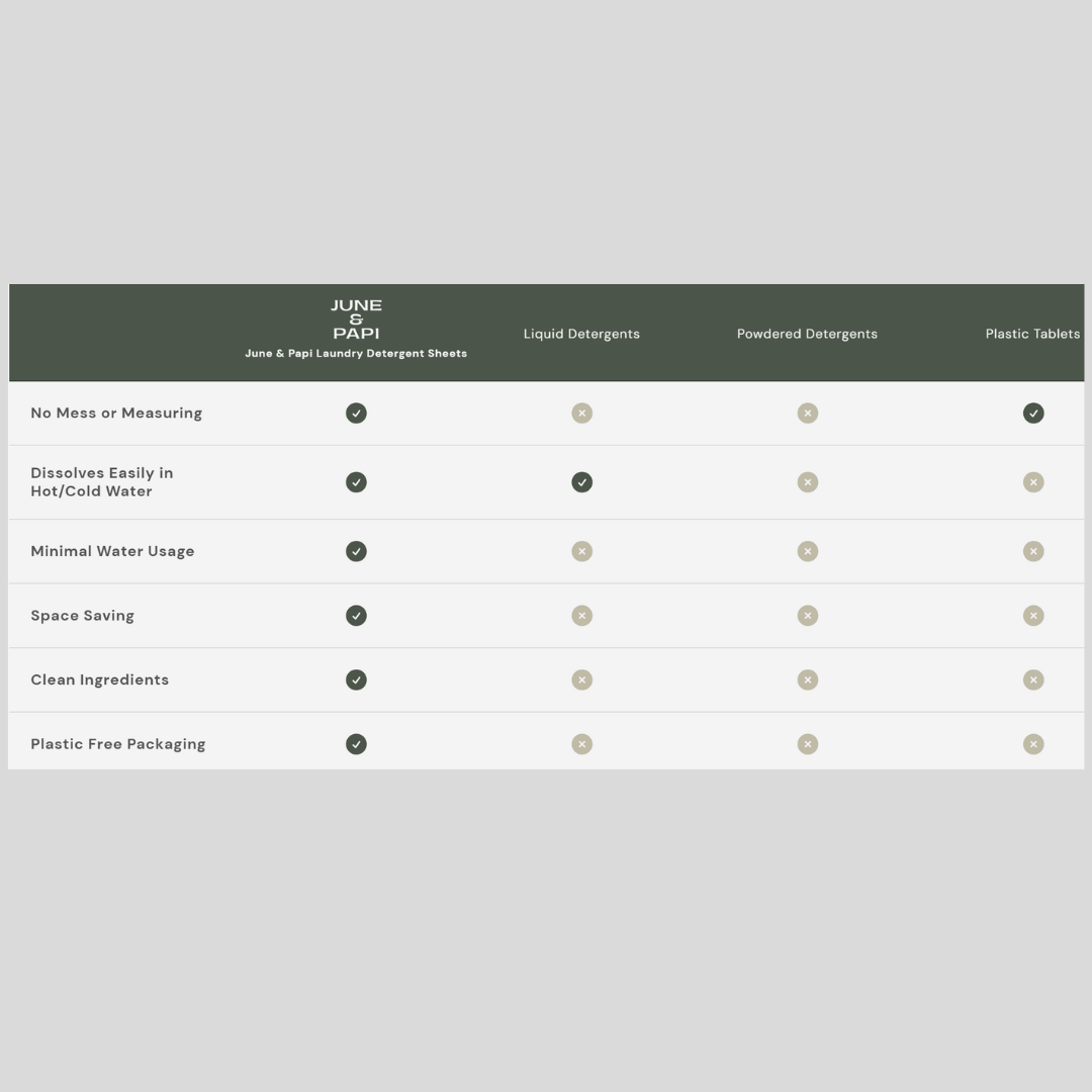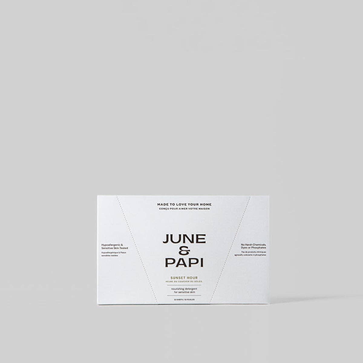 June & Papi laundry detergent sheets are formulated to deliver a concentrated cleaning action, dissolving quickly to remove tough stains. Crafted from biodegradable ingredients and packaged in eco-conscious materials. Made without: parabens, sulfates, 1.4 dioxane, phosphates, chlorine bleach, dyes, optical brighteners or starch **Hypoallergenic, safe on sensitive skin **Suitable for all standard or HE washing machines **Hot & cold wash compatible **Made with naturally derived and plant-based ingredients that are never tested on animals Scent profile: Velvety coconut with subtle undertones of vanilla and soft musk For full detailed information visit www.juneandpapi.com Contact us for bulk orders