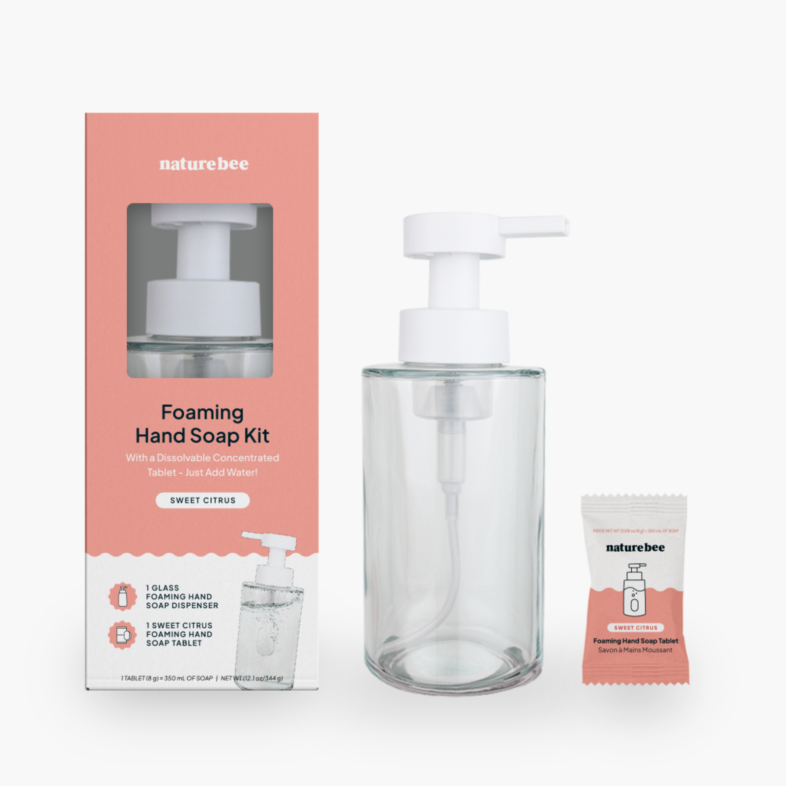 KIT INCLUDES: - One 350ml glass Foaming Hand Soap Bottle + pump top - One Concentrated Foaming Hand Soap Tablet HERE’S HOW IT WORKS: - Fill bottle with 350ml warm filtered water - Drop in one tablet - Let tablet dissolve fully - Happy cleaning! ABOUT THE SCENT: - Sweet Citrus → a bright, refreshing mix of sweet ruby red grapefruit and a hint of lemon FEATURES & BENEFITS: - Sustainable: bottle is refillable & recyclable at end of life - Minimal bottle & colourless soap fit in seamlessly with any decor - Pump dispenses a light, airy foamed soap - Quality heavy glass bottle prevents tipping - Tablets are vegan, eco-friendly and biodegradable For best results use warm filtered or boiled water. Fragile; handle with care. Avoid contact with eyes. Do not consume. Keep out of reach of children and pets.
