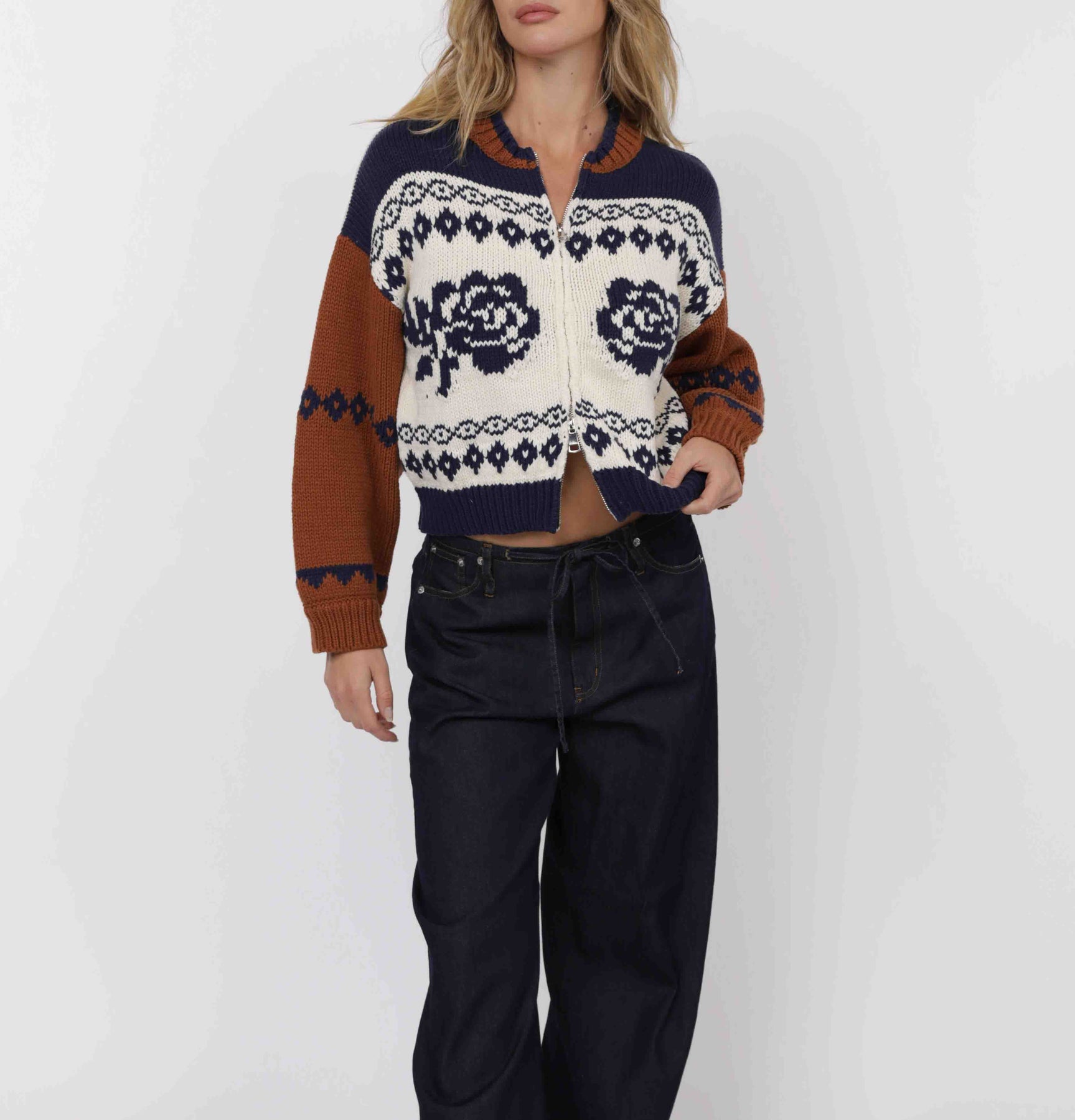 Wrap yourself in the cozy charm of the Sweet Rose Zip Sweater, featuring a delightful knitted print in warm fall colors. Perfect for crisp autumn days, this sweater blends comfort with playful style to brighten your wardrobe. Zip up and enjoy the season's spirit in snug, colorful softness!